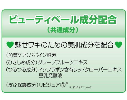 「ワキララ」ビューティーベール成分のひとつである角質ケア成分には、パパイン酵素が使用されています。パパインは、タンパク質分解酵であるプロテアーゼの中でシステインプロテアーゼに分類される酵素であり、植物由来のプロテアーゼとしては、現在最も研究が進んでいるもののひとつであるといえます。